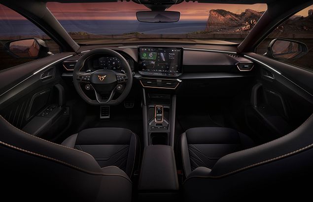 Im Innenraum setzt der Cupra Formentor auf hochwertige Materialien und eine durchdachte Anordnung der Bedienelemente. Die Sportsitze bieten exzellenten Halt und Komfort, auch bei dynamischer Fahrweise. Das serienmäßige digitale Cockpit liefert alle wichtigen Informationen übersichtlich und gut ablesbar direkt ins Sichtfeld des Fahrers. Das Infotainmentsystem mit einem 10-Zoll-Touchscreen umfasst Funktionen wie Navigation, Apple CarPlay und Android Auto, die nahtlose Konnektivität und Unterhaltung während der Fahrt gewährleisten. Eine kabellose Ladefunktion für Smartphones sowie mehrere USB-C-Anschlüsse runden das technologische Angebot ab.